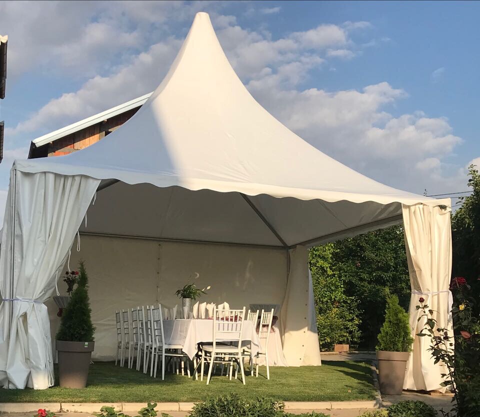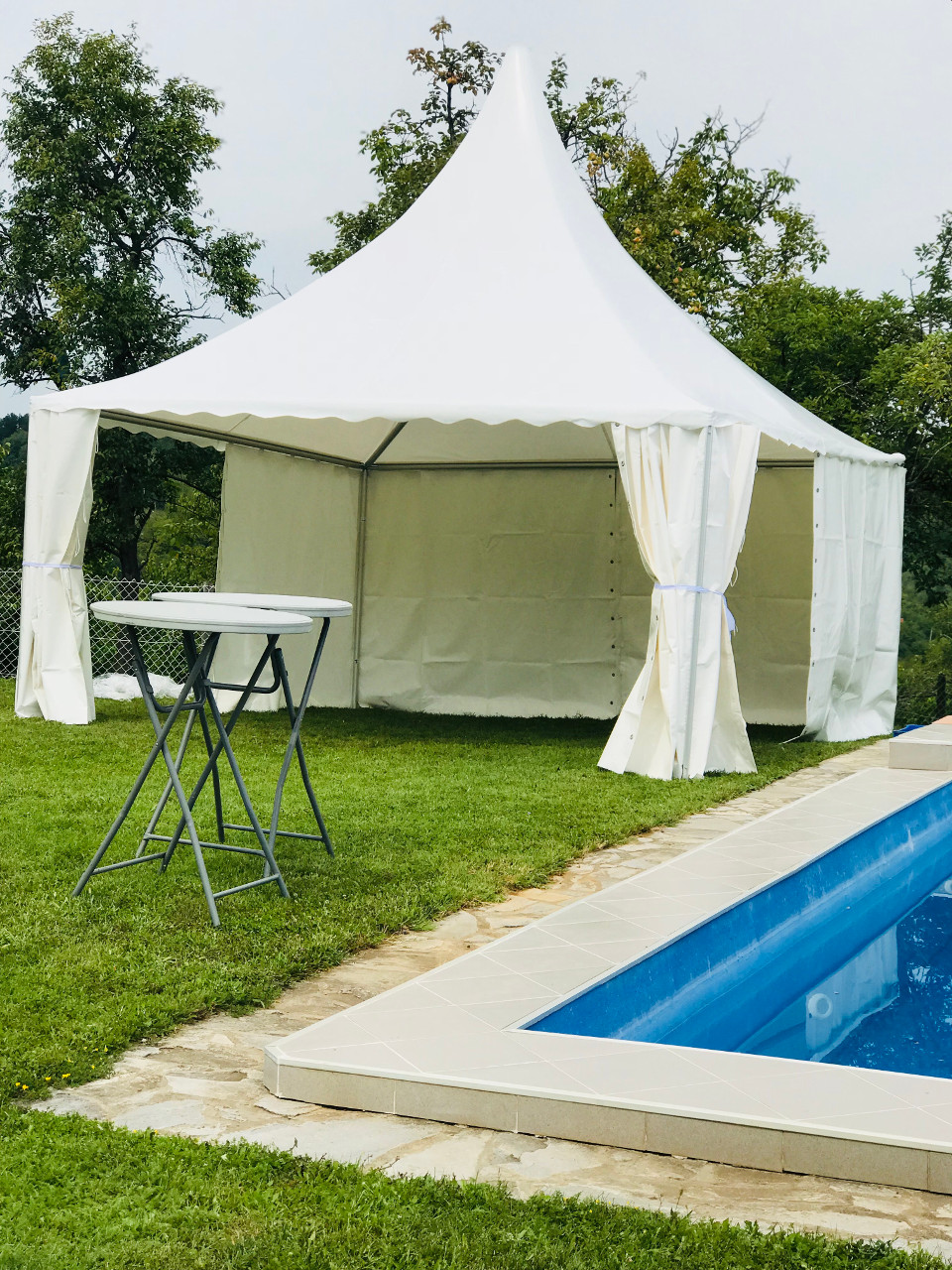 Pagode su dimenzija 5x5m (5 metara) izrađene od aluminijumske konstrukcije, zidovi i krov su od visokokvalitetnog PVC materijala.